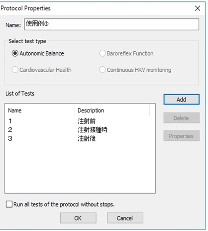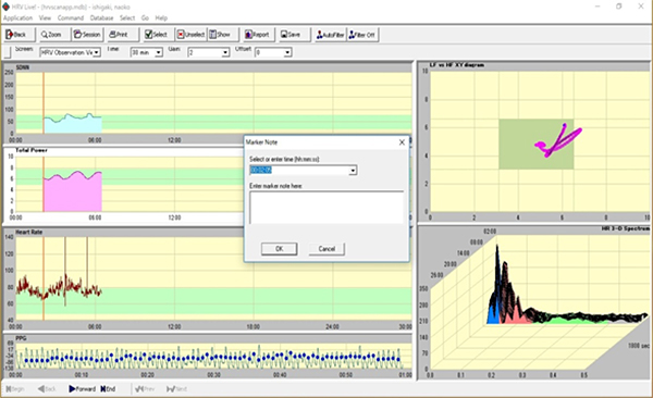 2については、注射針や薬液が体内に浸透している状態を含めた5分間の心拍変動解析の平均値が結果として表示される。